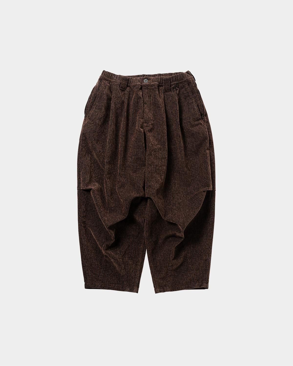 色違いの糸が折り込まれ、ドットのように見える太畝コーデュロイ生地を使用したバルーンパンツ。 裾を狭め、膝のタックで立体感とゆとりのあるシルエット。 スラッシュポケットとファスナー付きのサイドシームポケット、隠しマグネットボタン仕様のバックポケットを搭載。 ゴム入りのウエストバンドはベルトループと内出しのスピンドルコードを装備。 バックの右腰部分にはロゴ入りパッチ付きで、ウエストボタンもロゴ入りパーツを使用。